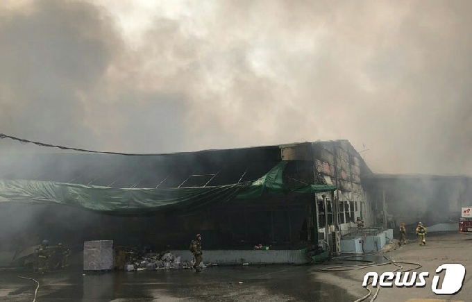 | 27일 오전 10시 50분께 경기도 용인시 처인구 한 물류센터에서 화재가 발생해 소방대원들이 화재 진압을 하고 있다. 소방당국은 이 화재로 인해 현재까지 인명피해는 없으며 화재 진압 후 화재 원인과 피해 규모를 조사할 계획이라고 밝혔다. (경기도재난안전본부 제공) 2018.3.27/뉴스1 © News1 오장환 기자 |